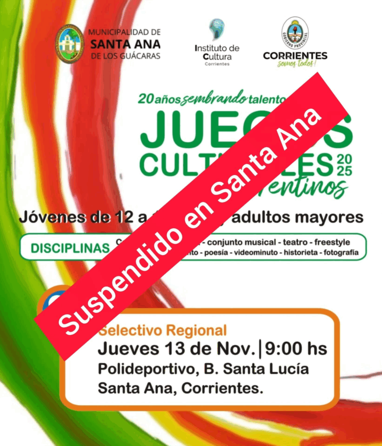 Se informa que la actividad correspondiente a los Juegos Culturales Correntinos 2025, prevista para realizarse en nuestra localidad, queda suspendida …