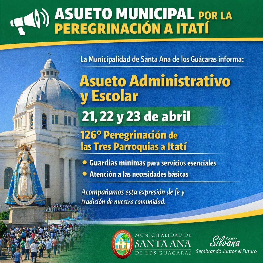 La Municipalidad de Santa Ana de los Guácaras informa que, mediante la Resolución N° 51/26, se adhiere al Decreto Provincial N° 842/2026, declarando asueto administrativo y escolar los días 21, 22 y 23 de abril, en el marco de la 126° Peregrinación de las Tres Parroquias a Itatí.