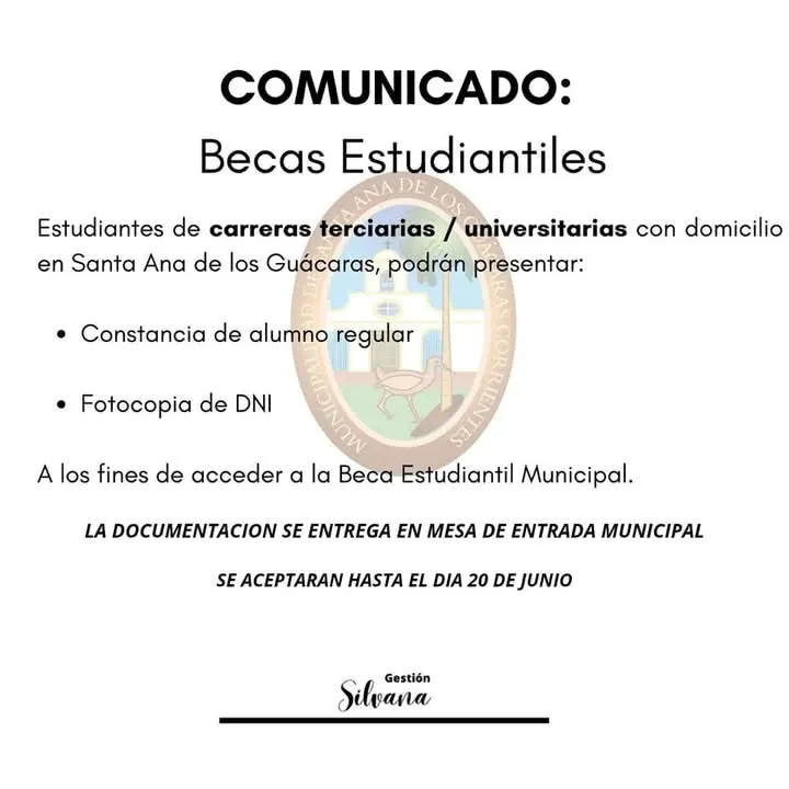 Si estás cursando una carrera terciaria o universitaria y tenés domicilio en Santa Ana de los Guácaras, podés acceder a la Beca Estudiantil Municipal.