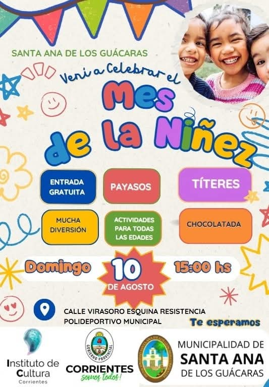Este domingo 10 de agosto, desde las 15:00 hs, los invitamos a compartir una tarde especial para celebrar en familia el Mes de la Niñez, en el polideportivo municipal.