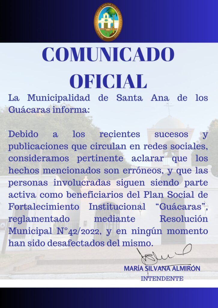 Debido a los recientes sucesos y publicaciones que circulan en redes sociales, consideramos pertinente aclarar que los hechos mencionados son erróneos, y que las personas involucradas siguen siendo parte activa como beneficiarios del Plan Social de Fortalecimiento Institucional «Guácaras», reglamentado mediante Resolución Municipal N°42/2022, y en ningún momento han sido desafectados del mismo.