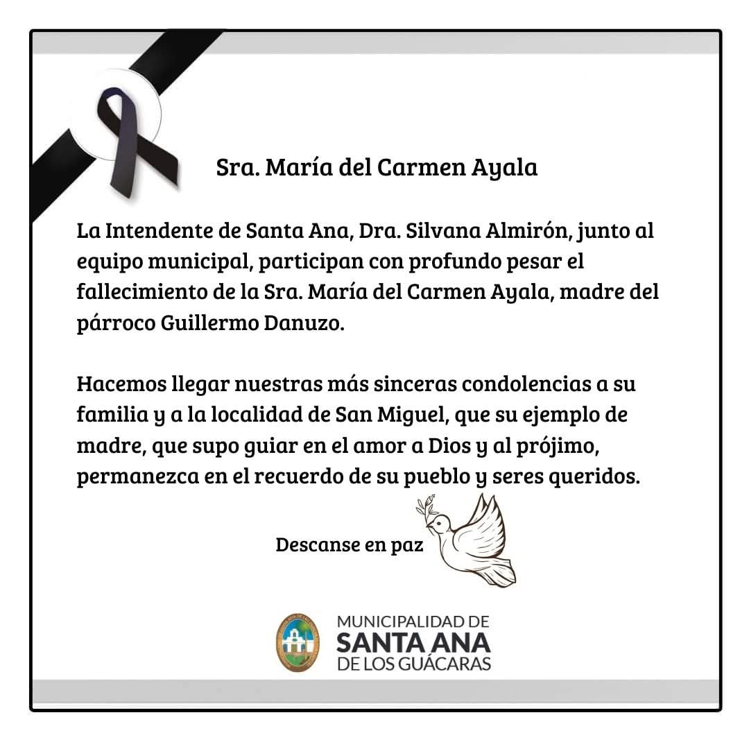 Desde Santa Ana de los Guácaras, nuestras respetuosas condolencias al párroco Guillermo Danuzo, por el fallecimiento de su madre, señora María del Carmen Ayala.