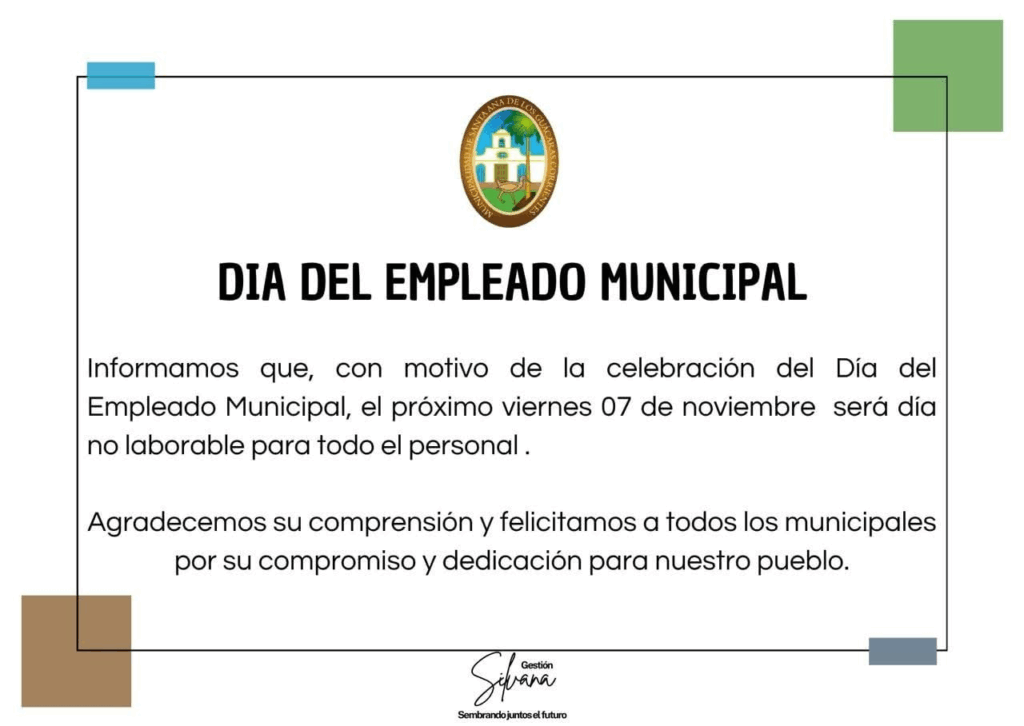 Con motivo del Día del Empleado Municipal, se informa que el viernes 7 de noviembre será no laborable para el personal de la Municipalidad de Santa Ana de los Guácaras.
