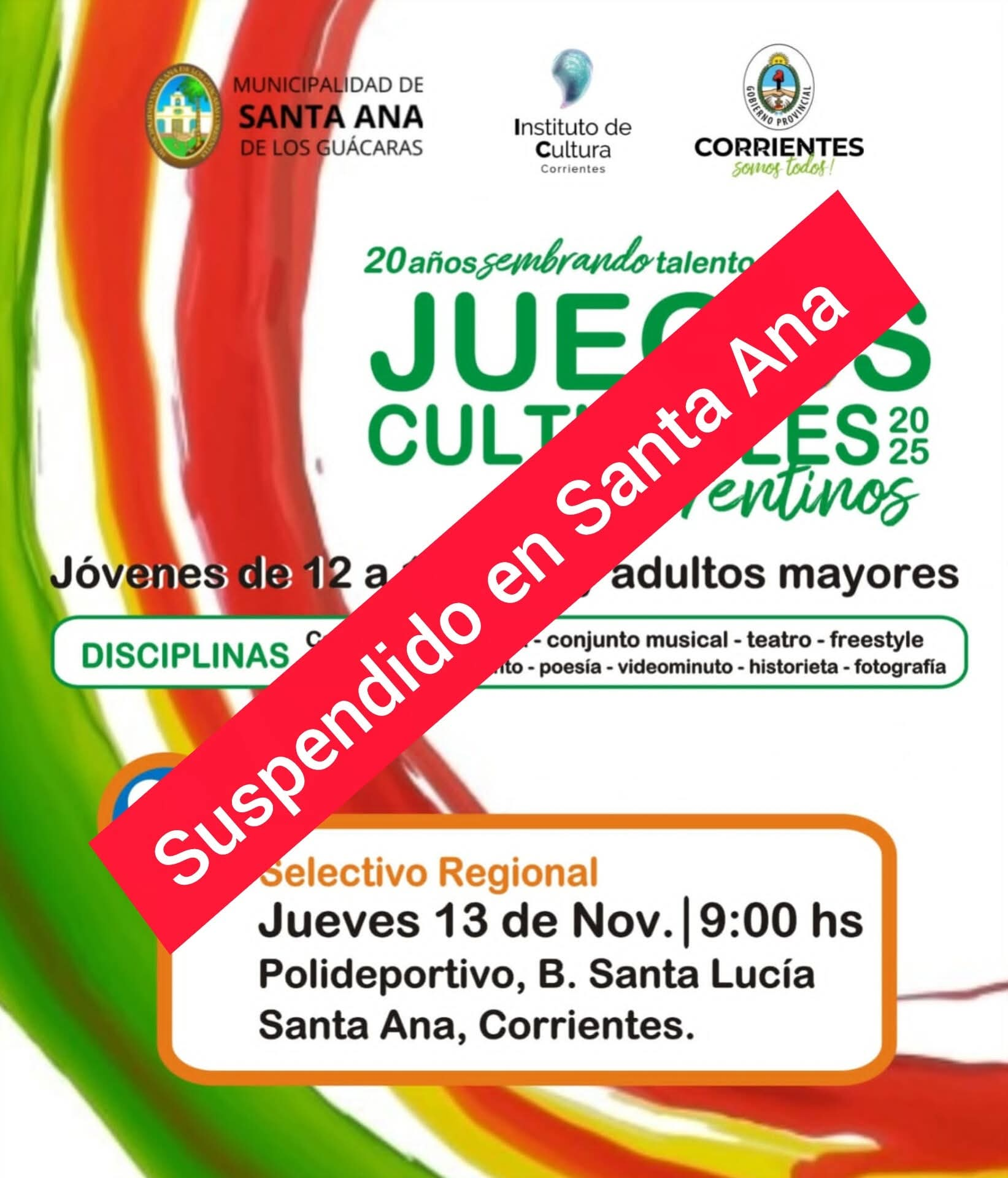 Se informa que la actividad correspondiente a los Juegos Culturales Correntinos 2025, prevista para realizarse en nuestra localidad, queda suspendida.