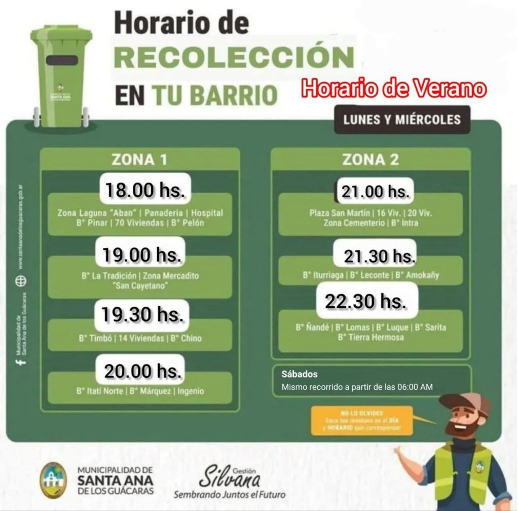 Se informa que, a partir del lunes 5 de enero, rigen los nuevos horarios de verano para la recolección de residuos: