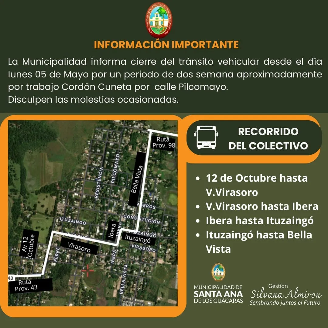 Vecinos, se informa que se realizará cierre de tránsito vehicular, por trabajos de obras públicas por calle Pilcomayo y se modifica recorrido del colectivo, a partir de este 5 de mayo y por aproximadamente dos semanas.