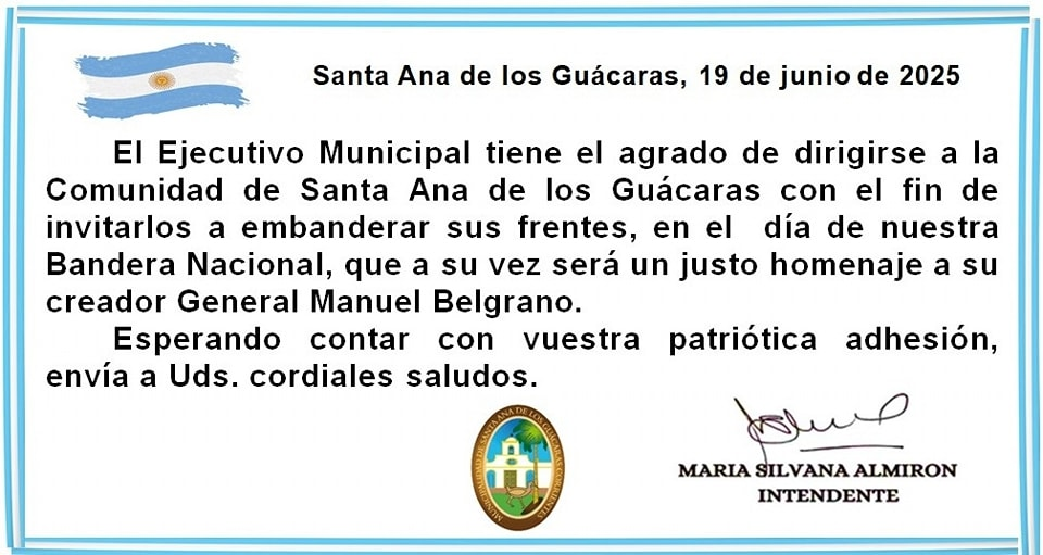 Este 20 de junio, a las 9:00 hs, la intendente Silvana Almirón, equipo municipal y representantes de instituciones, realizarán el Izamiento del Pabellón Nacional.