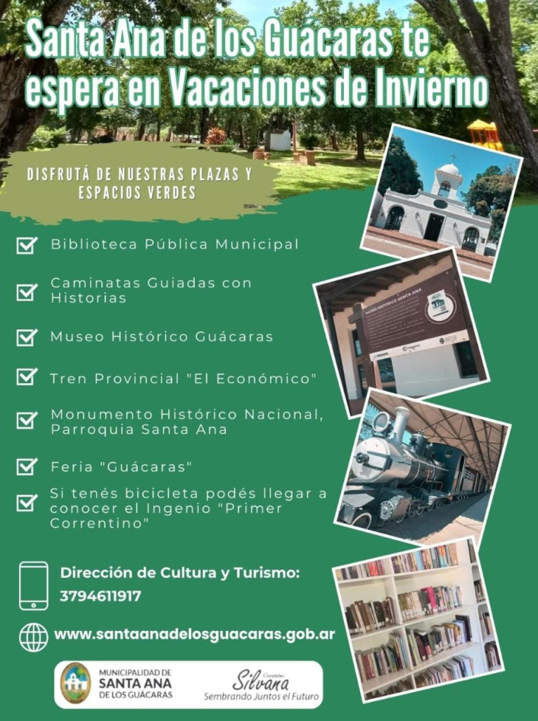 Conocé la Biblioteca Pública custodia de las letras de autores correntinos, el Museo Histórico Guácaras, el Monumento Nacional Parroquia Santa Ana, El Trencito Económico y mucho más. También podés recorrer nuestros espacios verdes, plazas con mesas de ajedrez, ferias de emprendedores y hasta llegar en bicicleta al histórico Ingenio Primer Correntino.