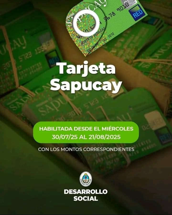La Dirección de Acción de Social de Santa Ana informa que la Tarjeta Sapucay está habilitada desde el 30 de julio hasta el 21 de agosto 2025, con la acreditación de los montos correspondientes.