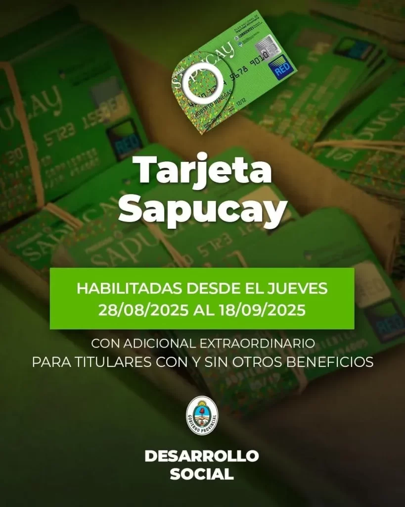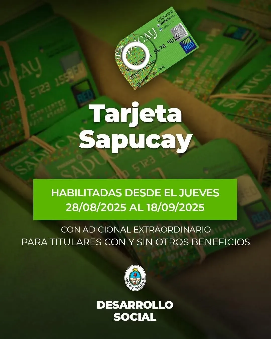 La Dirección de Acción Social de Santa Ana informa que las tarjetas sapucay estarán habilitadas desde el 28 de agosto al 18 de septiembre de 2025, con un adicional extraordinario para todos los beneficiarios.